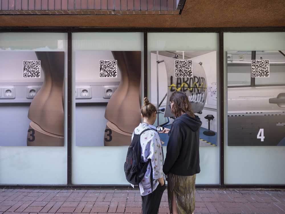 His work Laboratory Life, which was created specifically for Münster, is based on the interplay between moving pictures and scientific experimental set-ups. In these films, Bunte removes everyday occurrences — like the rotation of a car-wash brush on a windscreen, a plastic bag flapping in the wind, or someone putting in a contact lens — from their original context and places them in a laboratory-like setting under video surveillance. Bunte’s films enabled viewers to observe isolated processes in a new light, particularly when ‘motion capture’ was used to reduce the performance of an everyday activity to an abstract dance of points and lines in front of a black background or when human limbs are replaced by robot arms. By means of QR codes that have been printed on posters and hung up around Münster, these everyday choreographies could be watched on viewers’ phones. In other words, the films were not screened in interior spaces but could be activated on any standard smartphone by scanning the QR codes. The film posters were pasted straight onto the architectural surface of the city. In this way, the video surveillance under lab conditions unfolded in a direct encounter with actual everyday life in Münster. With the help of our constant companion, the portal we call the phone, Bunte’s Laboratory Life opened a brief cinematic windows for us through which to view an urban environment.
