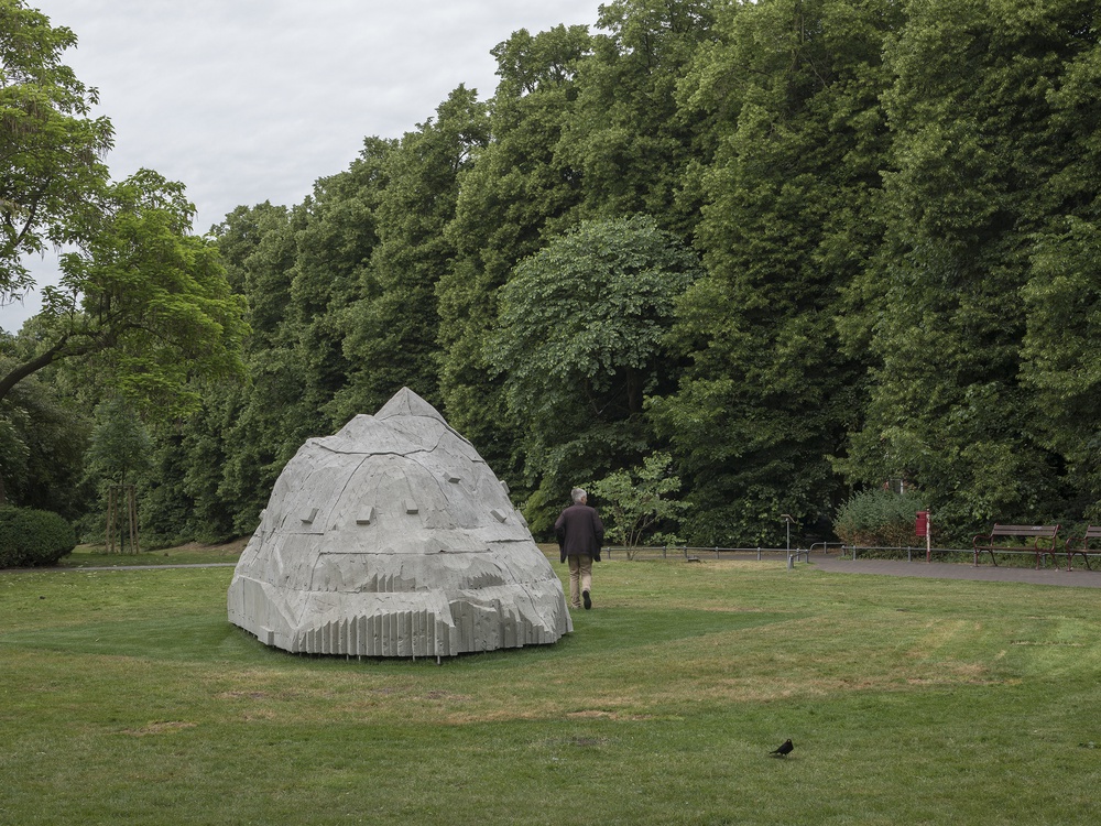 Matherly’s sculpture on the grassy area along Münster’s Promenade looked as if it had fallen from the sky. The surface of the material exhibited cracks and holes in many places. The walkers clearly protruded in some spots and in others completely vanished inside the grey material. As ready-mades or everyday objects, they assumed the function of a pedestal and also become part of the sculpture. In the artist’s conception, these objects introduce a scale that is closely related to the human body. Some of the walkers used in this sculpture were not new and came from the wider Münster area. Despite its massive presence, the sculpture emanated a lightness, appearing to hover above the earth.
