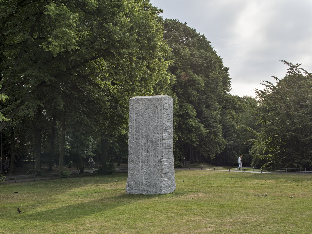 Favaretto’s ongoing series of Momentary Monuments has been executed in various forms since 2009. For Skulptur Projekte 2017, this series has been continued on the Promenade and in the neighbouring town of Marl, in each case with a hollowed-out granite boulder. At first sight, the four-metre-high stone seemed to be an alien object or a glacial erratic. And yet, when circling the boulder, it became evident that it was wrought by hand, which raised questions as to its function. There was a little slot that money can be dropped into. At the end of the exhibition the stone was destroyed, the resulting gravel reused, and the collected money donated to charity. The artist has decided to give the money to the organization Hilfe für Menschen in Abschiebehaft Büren e. V. (offering help to people facing deportation).